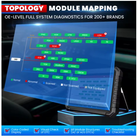 Intuicyjny kolorowy wyświetlacz topologii wszystkich struktur pomiędzy modułami pojazdu w celu łatwego rozwiązywania problemów.